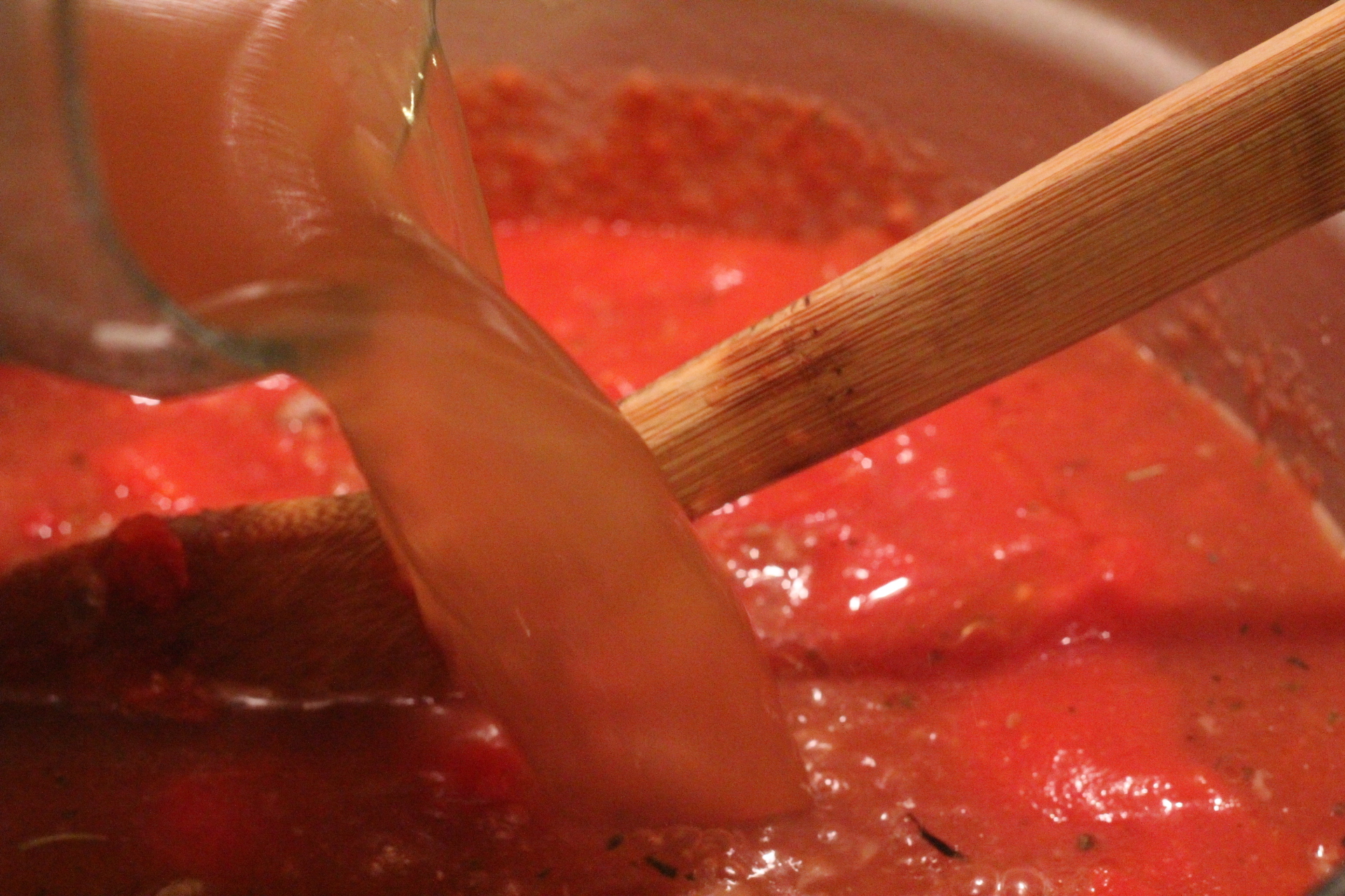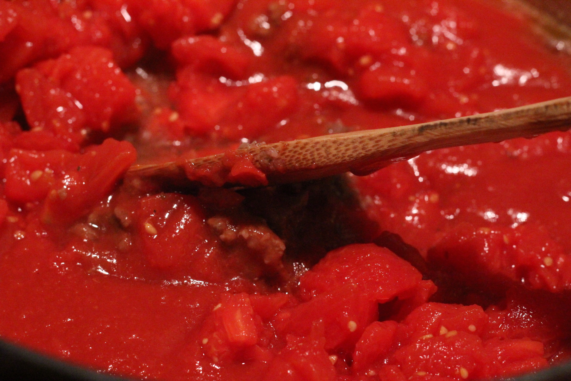 Stir in tomato paste, tomato sauce and diced tomatoes.