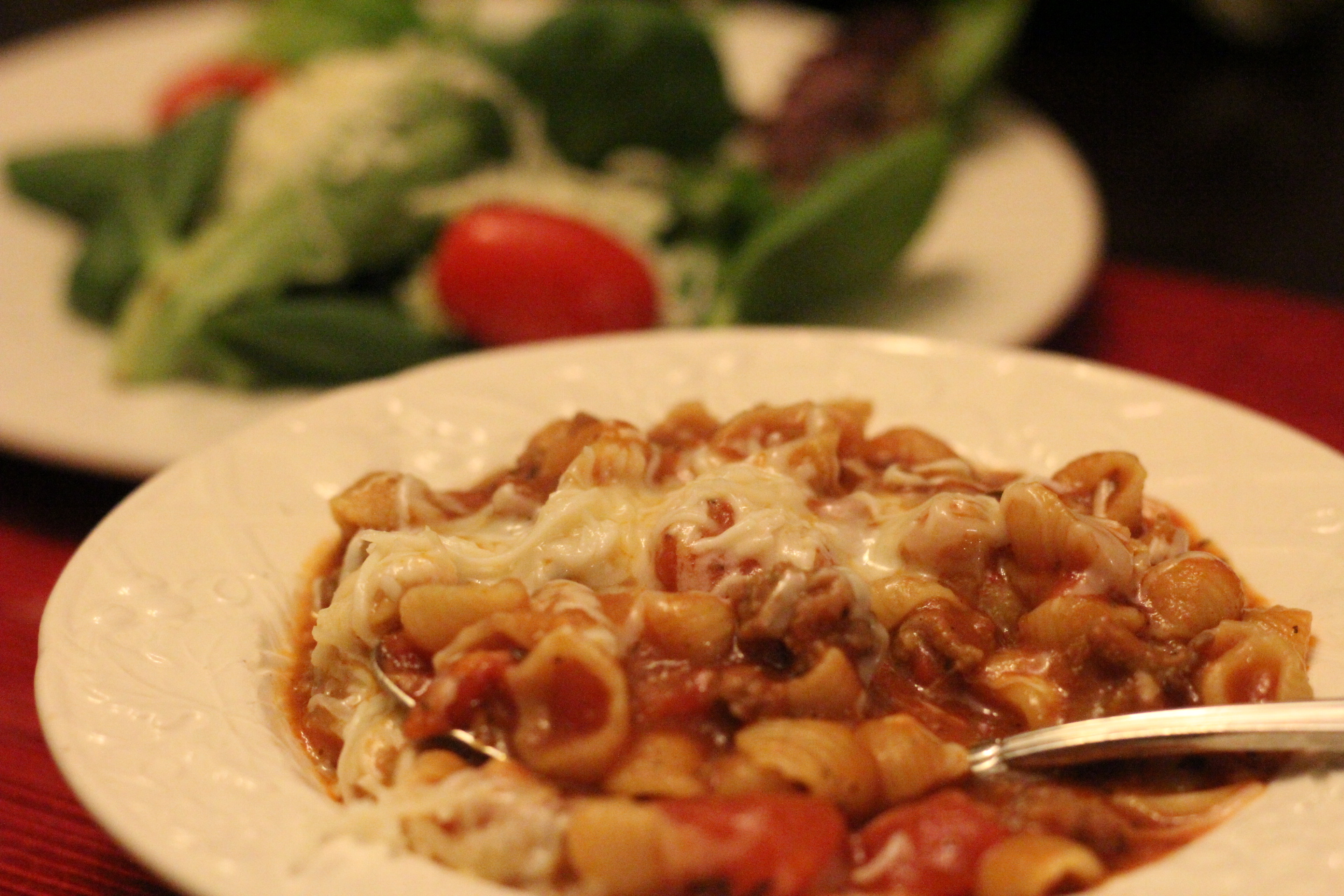 Pour in the pasta and continue to boil for another 9-10 minutes. Stir frequently to make sure pasta is not sticking to the bottom of the pot. After 9-10 minutes, turn heat down to a simmer until ready to serve.