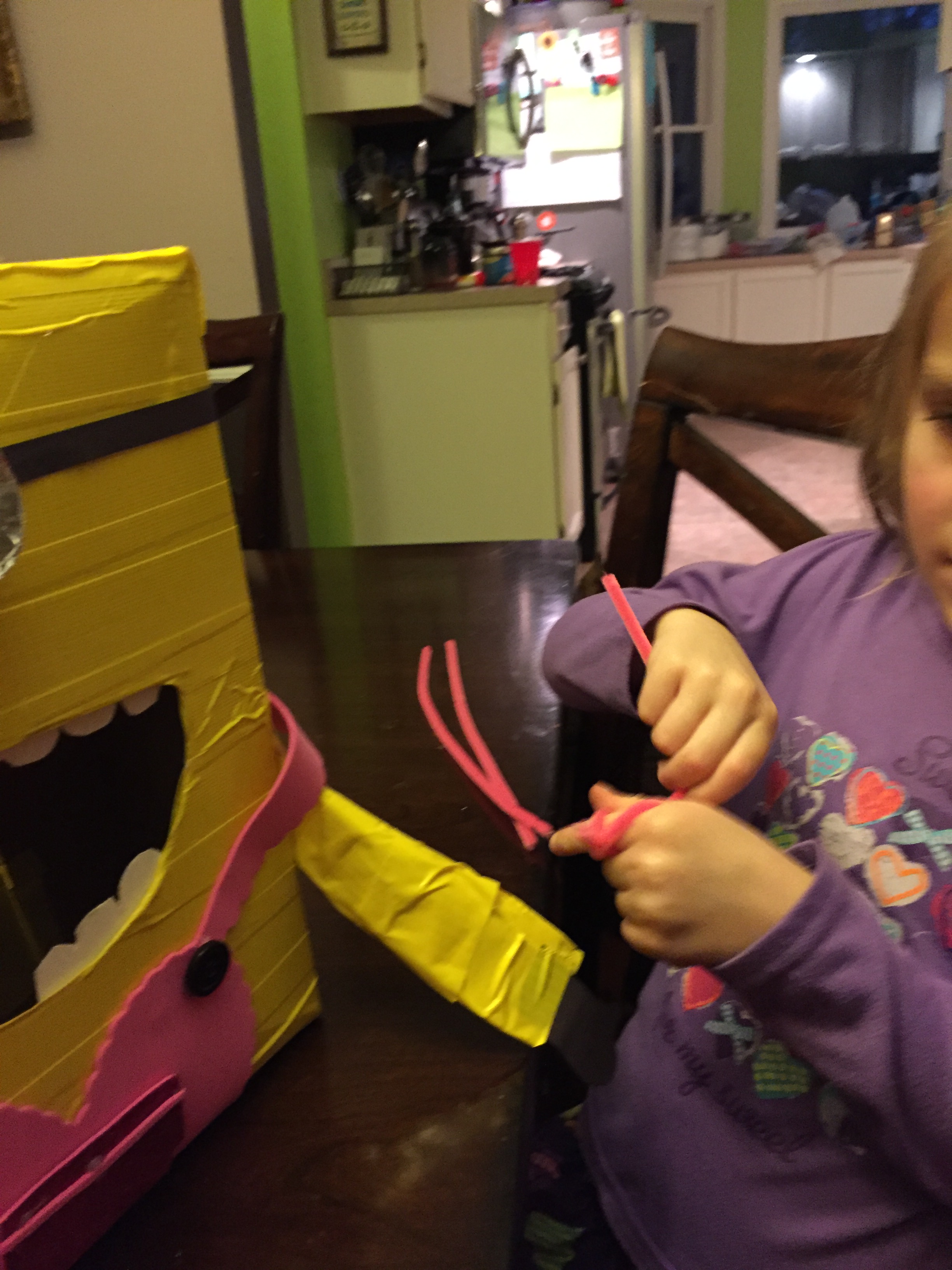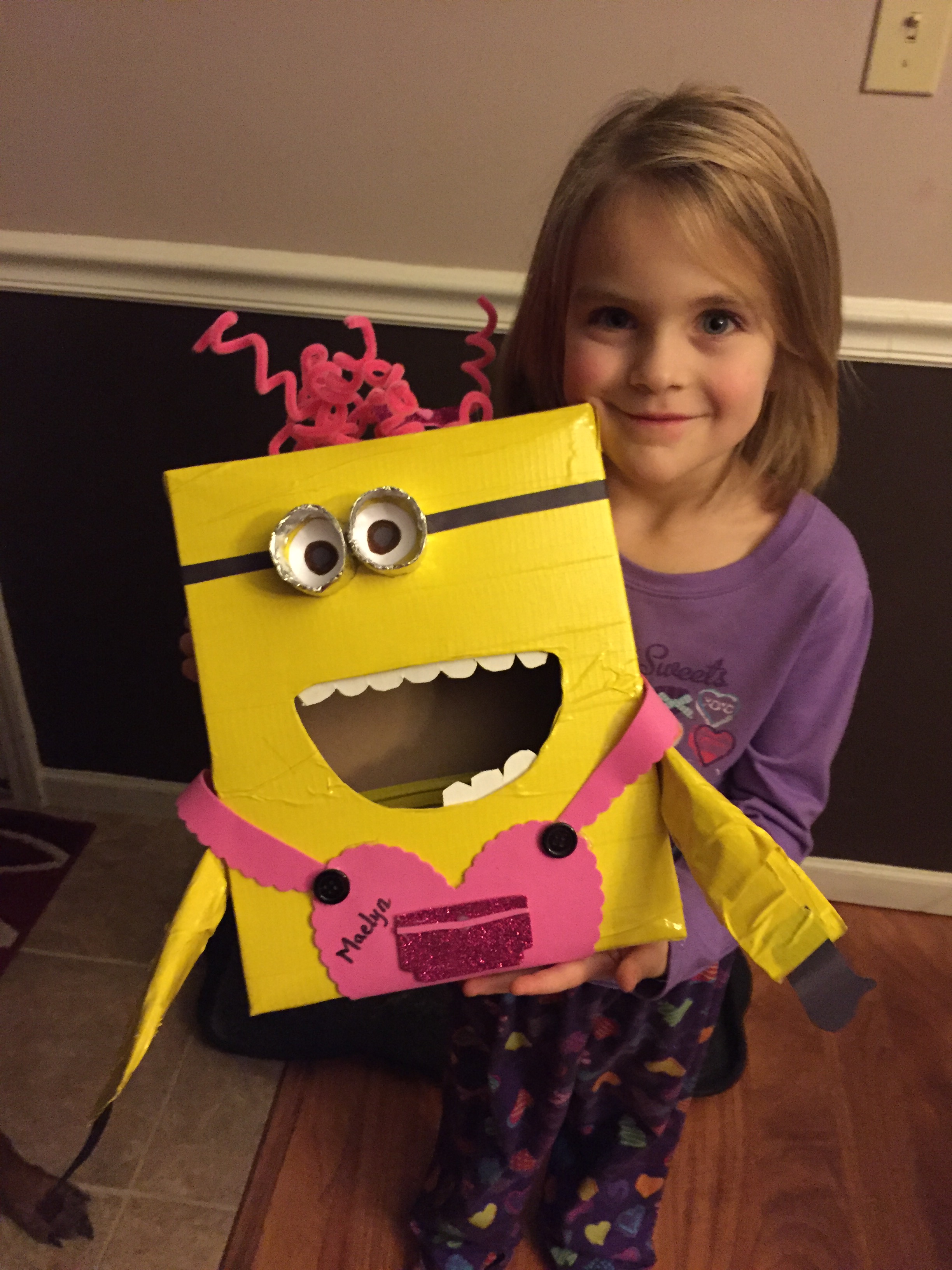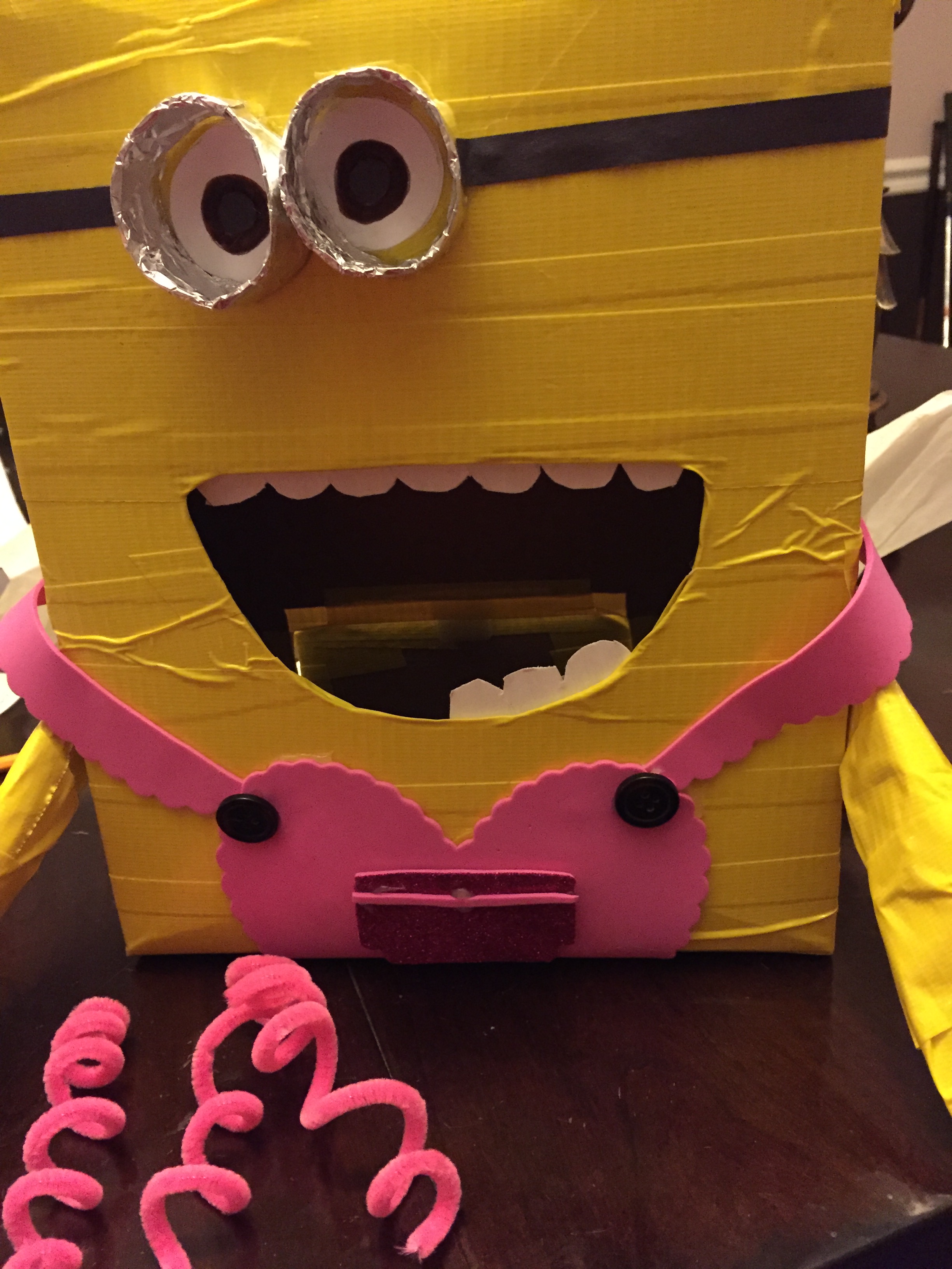 The hair was my little minion’s favorite part. She wrapped the pink pipe cleaners around her finger and then I hot glued them to the top of the box so they looked like crazy minion curls.