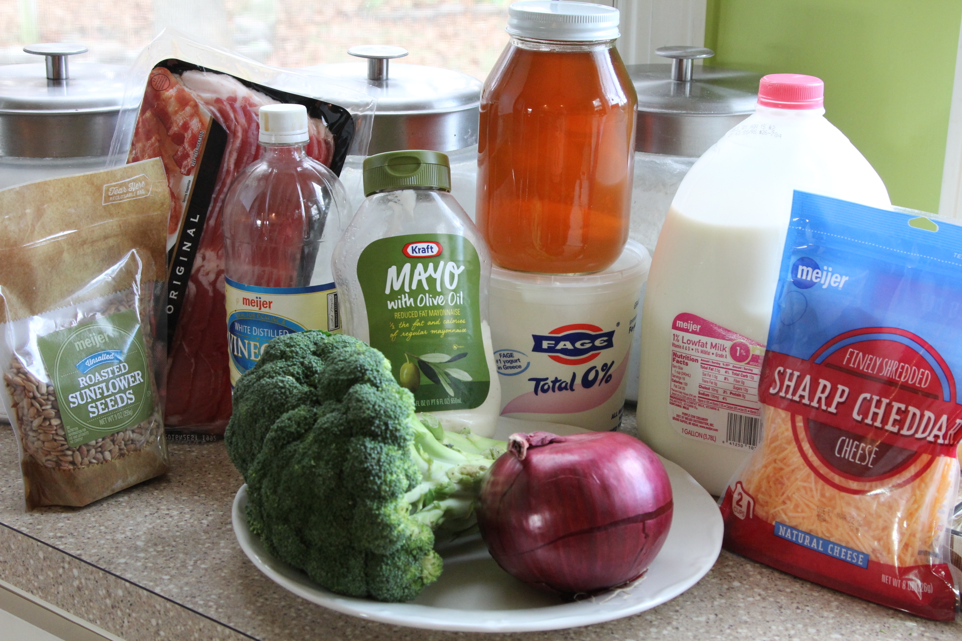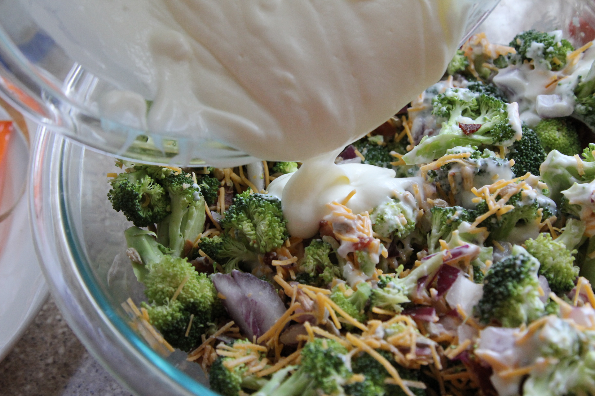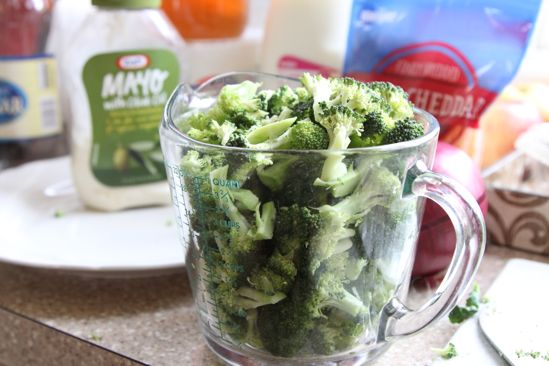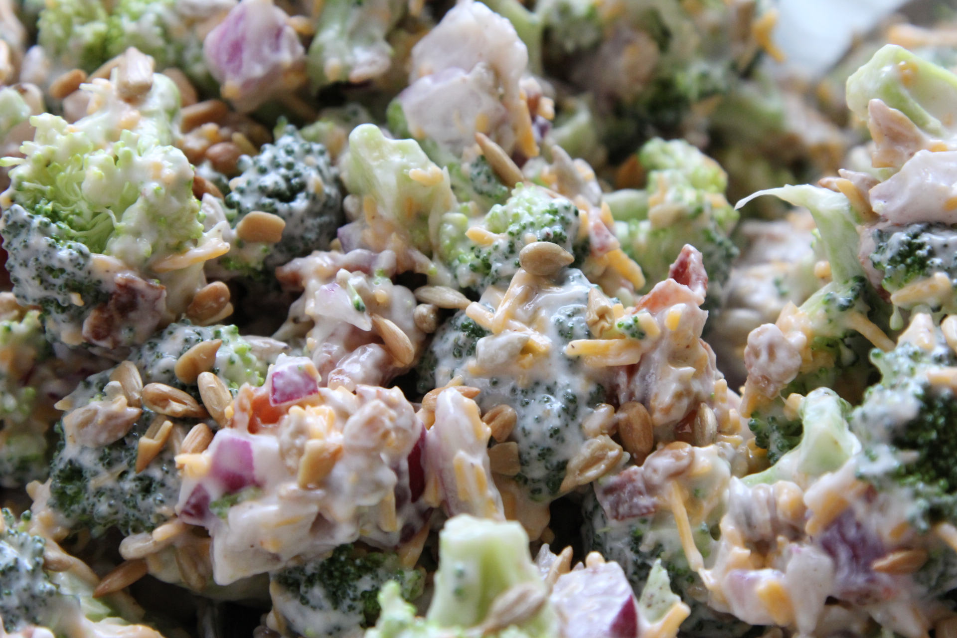 Today it’s the first day back to school after Spring Break. I’d say the girls have a wee bit of the back to school blues. Not that we went on some sunny vacation or anything, but they enjoyed their break and didn’t want to get up this morning. Lots of moans and grumbles even though I surprised them with a little strawberry smoothie to help brighten their day. I’m ready to get back to our routine and eating a little better. Man, we know how to pack in the junk food while we are on break – brownie sundaes, fast food, big ole burgers, dinners out, chips and queso dip, you name it, we probably ate it! So this week I’m going to try to get back at tracking and caring about what I eat. Once I get going, I really don’t have any issues with being active and working out, my struggle is the eating part. And it’s the part that’s so important. I can undo any great workout so easily and not even realize it. Obviously I love food. I love cooking, and if you’ve checked out my recipes, they are definitely not always the healthiest, that’s for sure. I just can’t do fake or diet tasting food. Nope, just can’t do it. I’d rather go without, rather sacrifice in another area in order to have the item I want, or find a way to try to make the dish a little healthier. I like a good broccoli salad, but even though it has broccoli, I know it’s not always the healthiest salad. So, I’ve tried to make a few changes to the standard broccoli salad to improve the healthiness factor, without sacrificing one bit of the taste.