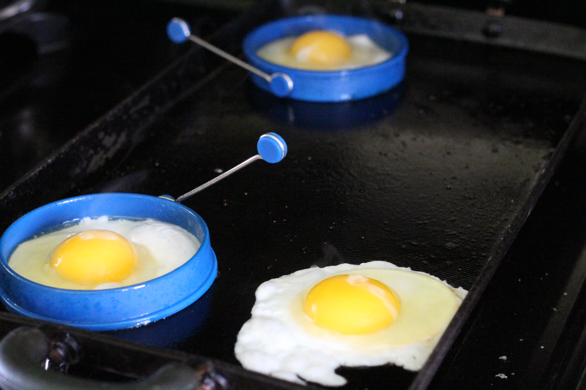 I fried up the eggs on the griddle. I used the silicone egg rings for a few of them but I only have two rings so the rest were just au natural. Seasoned eggs with a little salt and pepper.