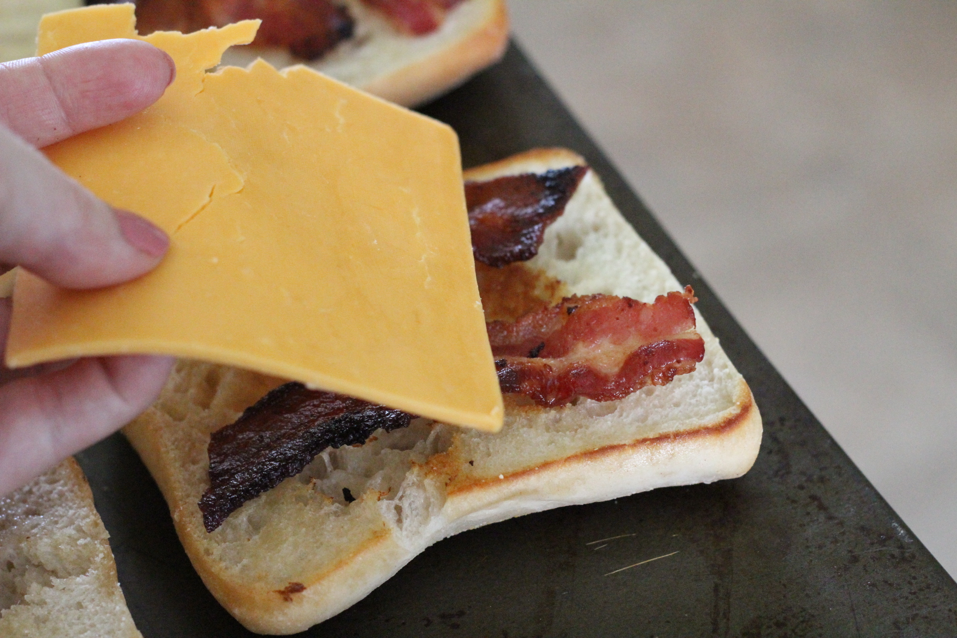 I assembled the sandwiches with the cooked bacon and cheese.