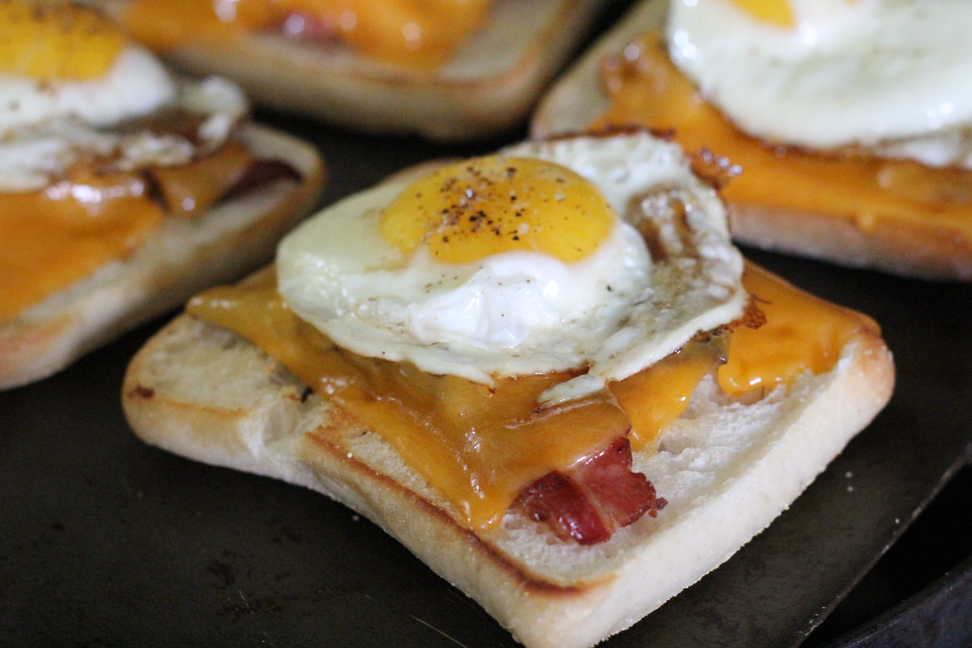 Placed them under the broiler just for a few seconds to melt the cheese and then topped each one with the cooked egg and added the top.