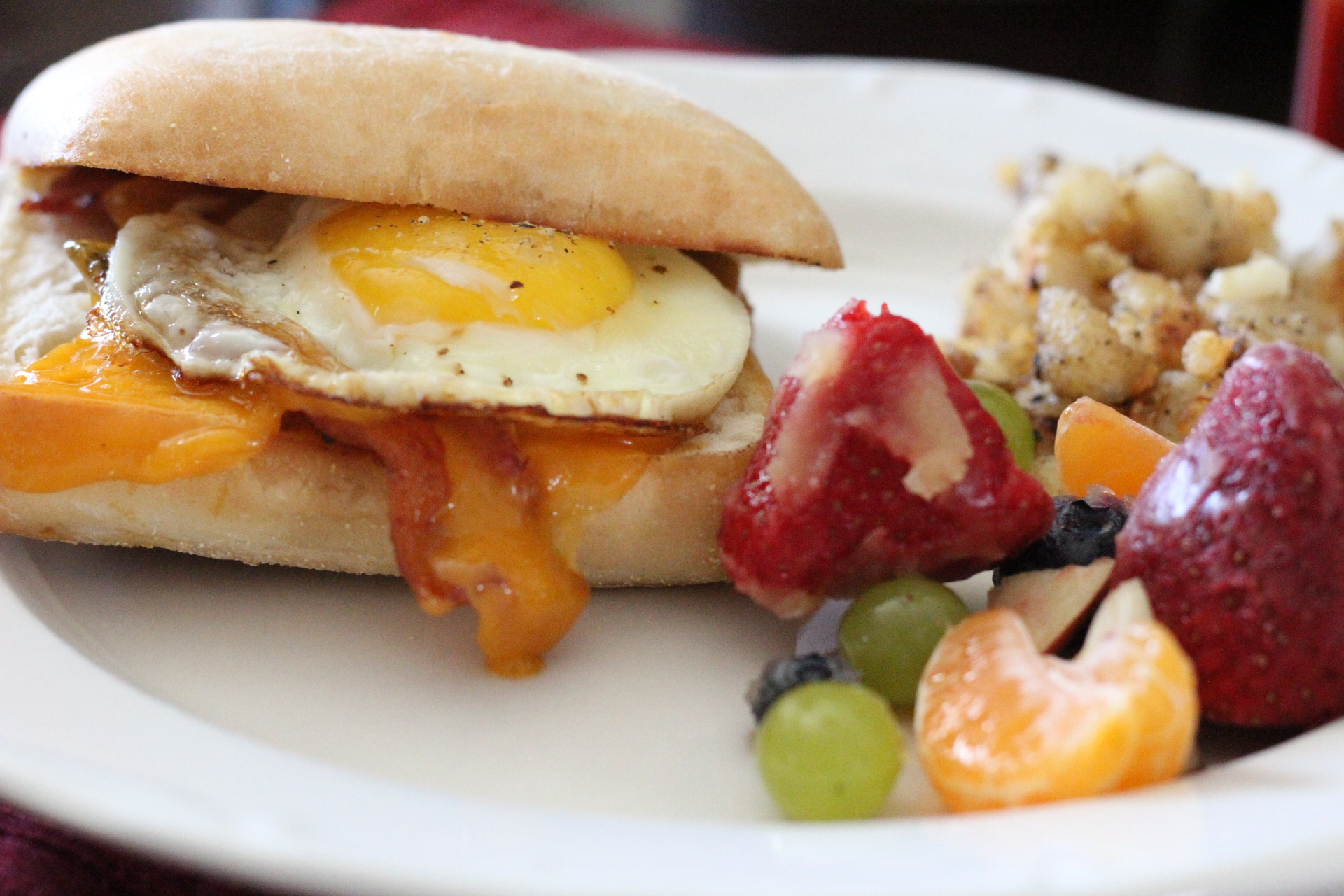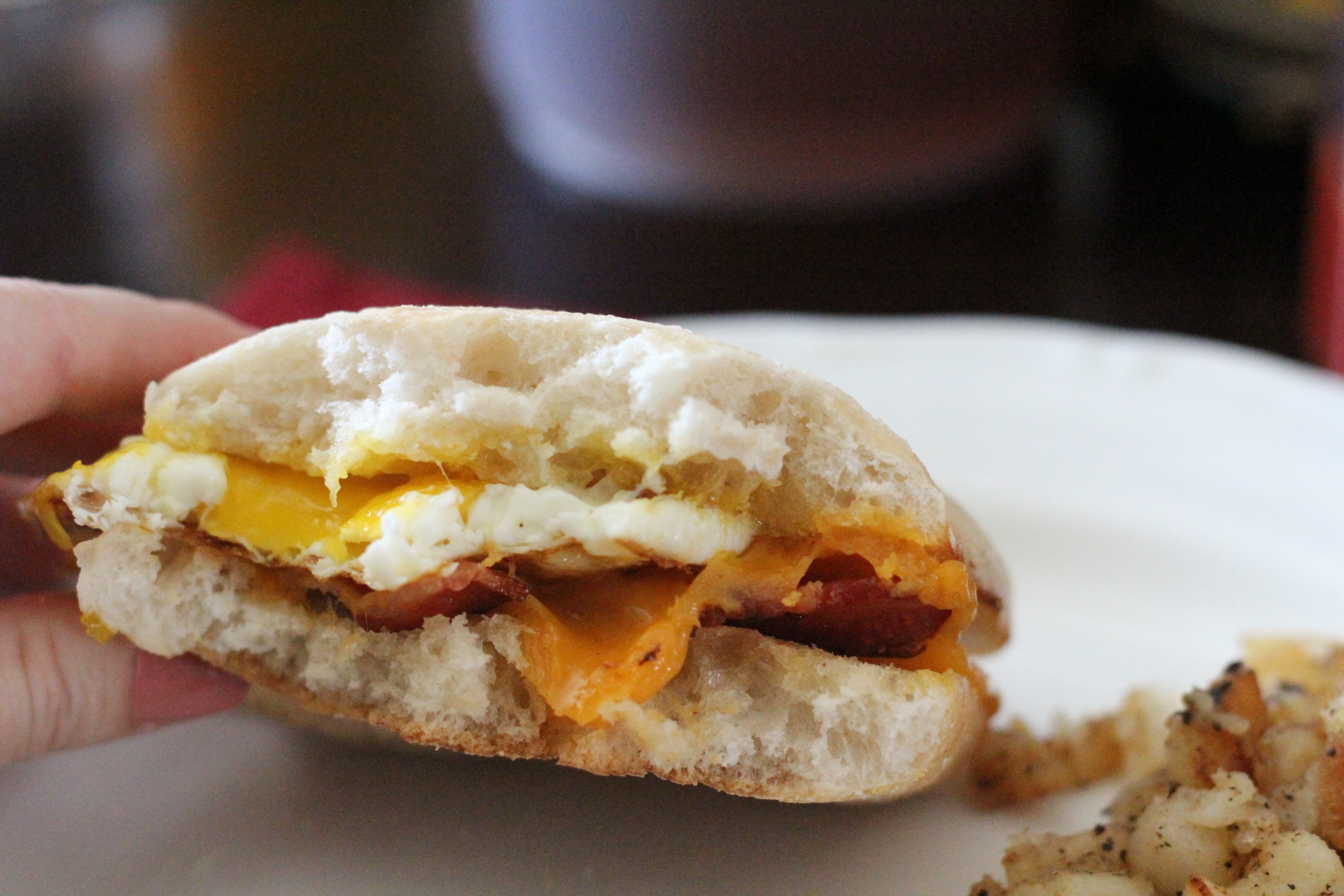 Really, there’s no recipe needed for these, just use whatever ingredients you like. I made mine with bacon, eggs over easy, and sliced cheddar cheese. Can’t go wrong there. The best part is that these keep for a few days in the fridge. I made a few extras and just put them in a container in the fridge and one busy morning, I grabbed one, wrapped it in a paper towel and microwaved it for a few seconds. I ate it as we ran out the door. It hit the spot and stayed with me better than any breakfast bar or sugary cereal ever does. I will have to freeze a few next time I make them to experiment and see how they turn out. Now this little meal has carbs, but you could cut them down by serving it on only half the ciabatta and more of an open face style.