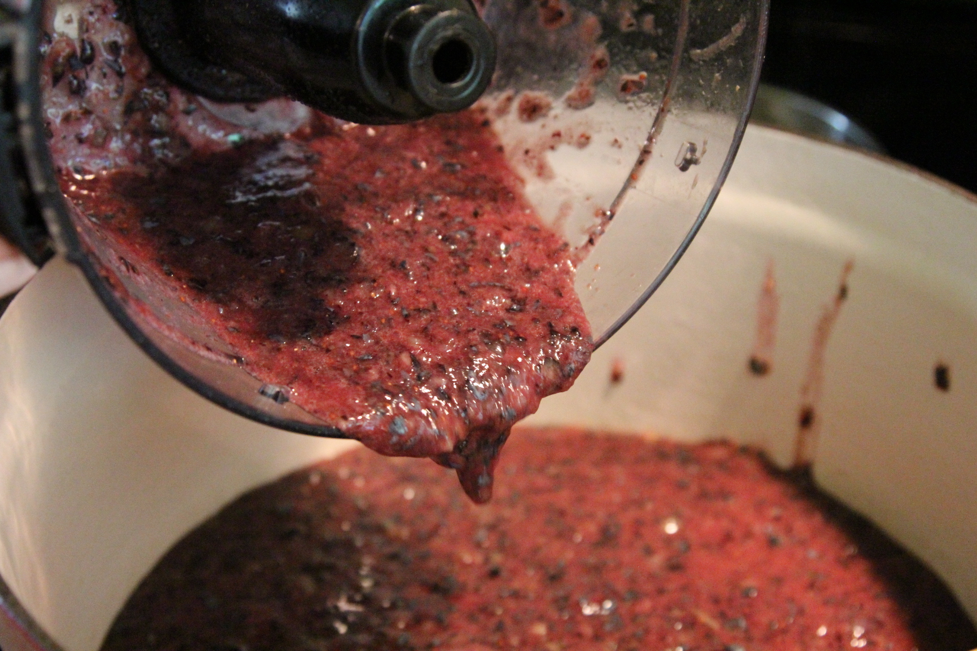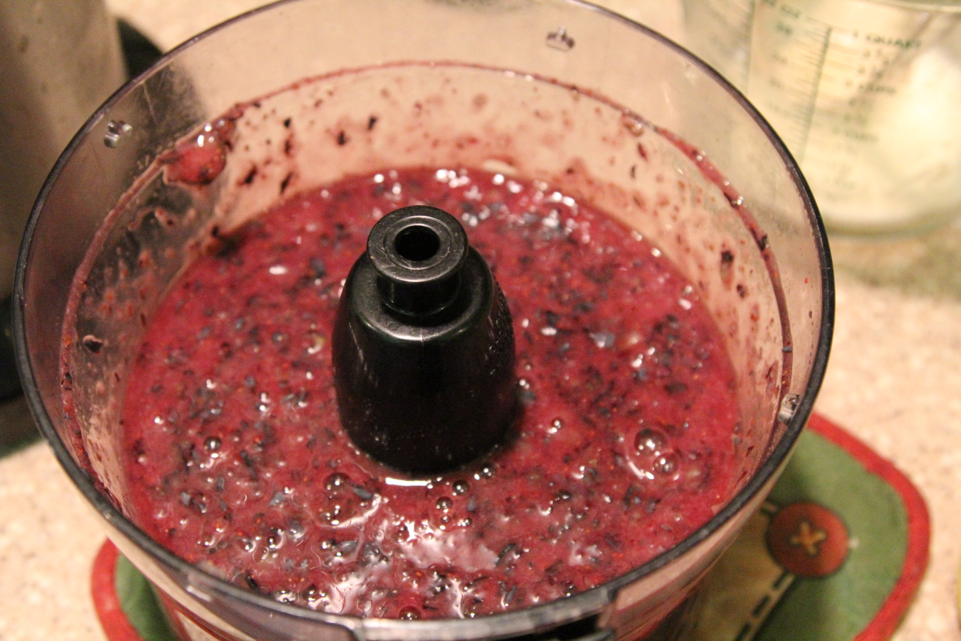 Mash the berries. You can do this by hand with a potato masher, pastry cutter, little fingers that will be stained forever, or you can whip out your food processor and make it a lot easier!