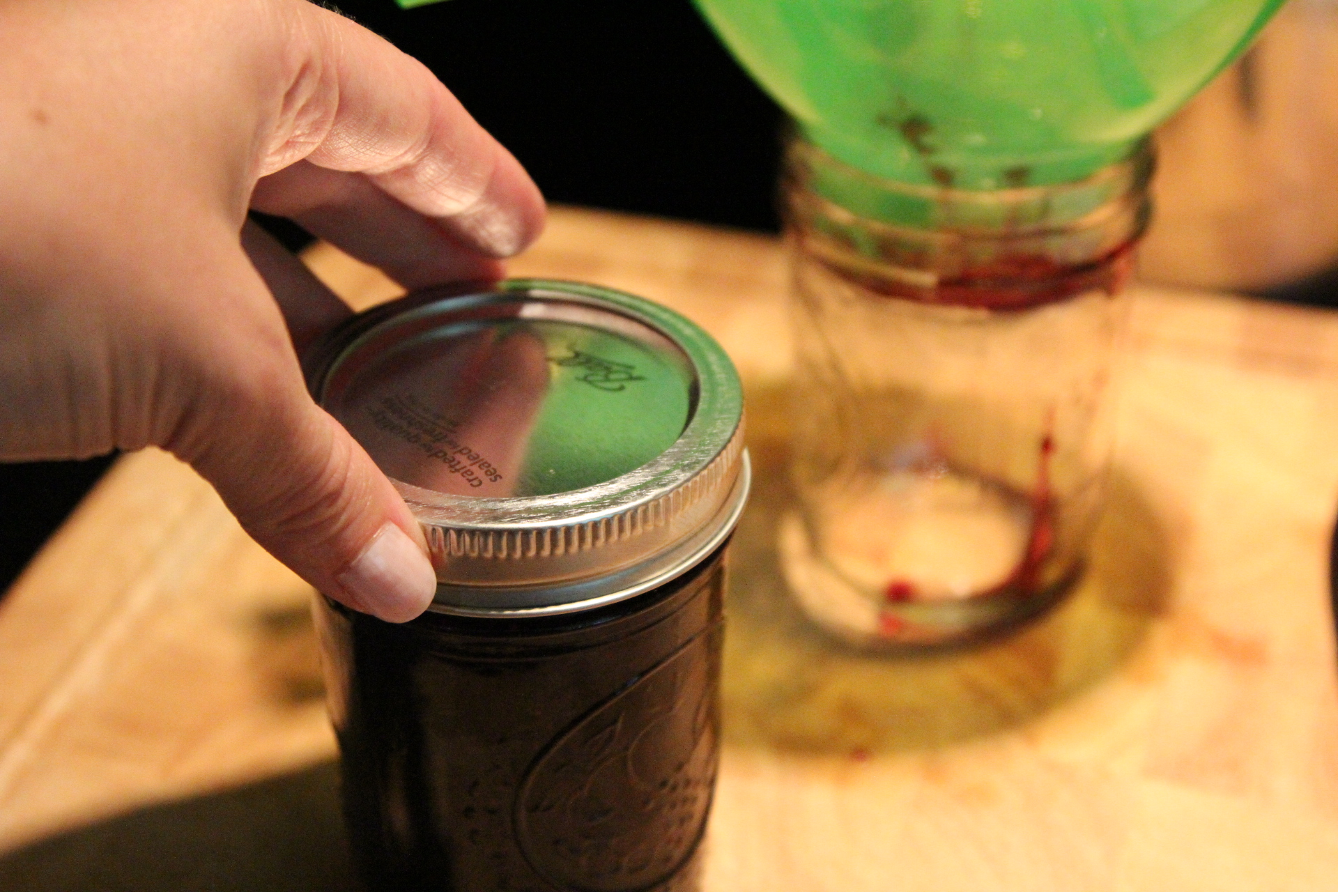 Fill the jar with the jam leaving 1/4 inch of space at the top of the jar. Try to get equal amounts of liquid and fruit chunks into each jar so your batch is consistent.