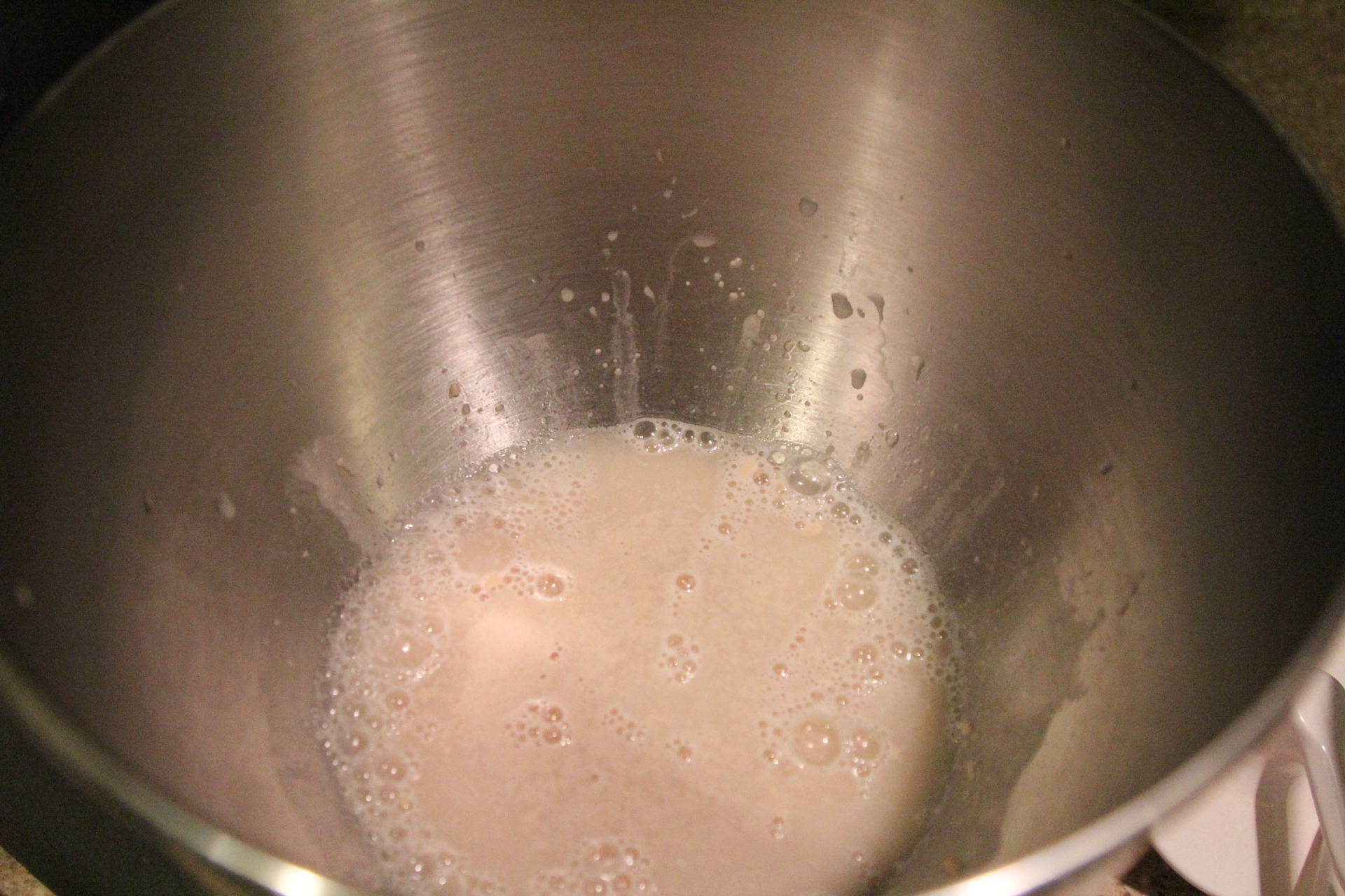 Scrape the sides of the bowl and dough hook occasionally with rubber spatula.