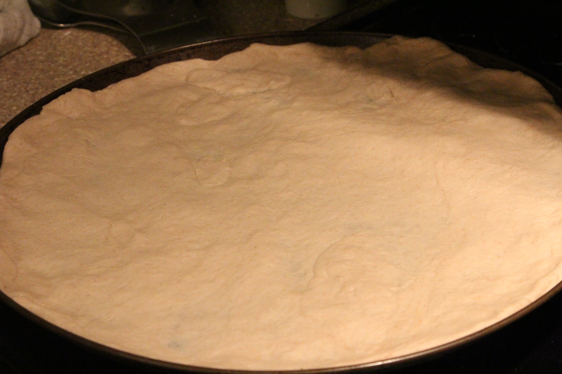Once it’s risen, form it into a pizza crust on a lightly oiled pizza pan.