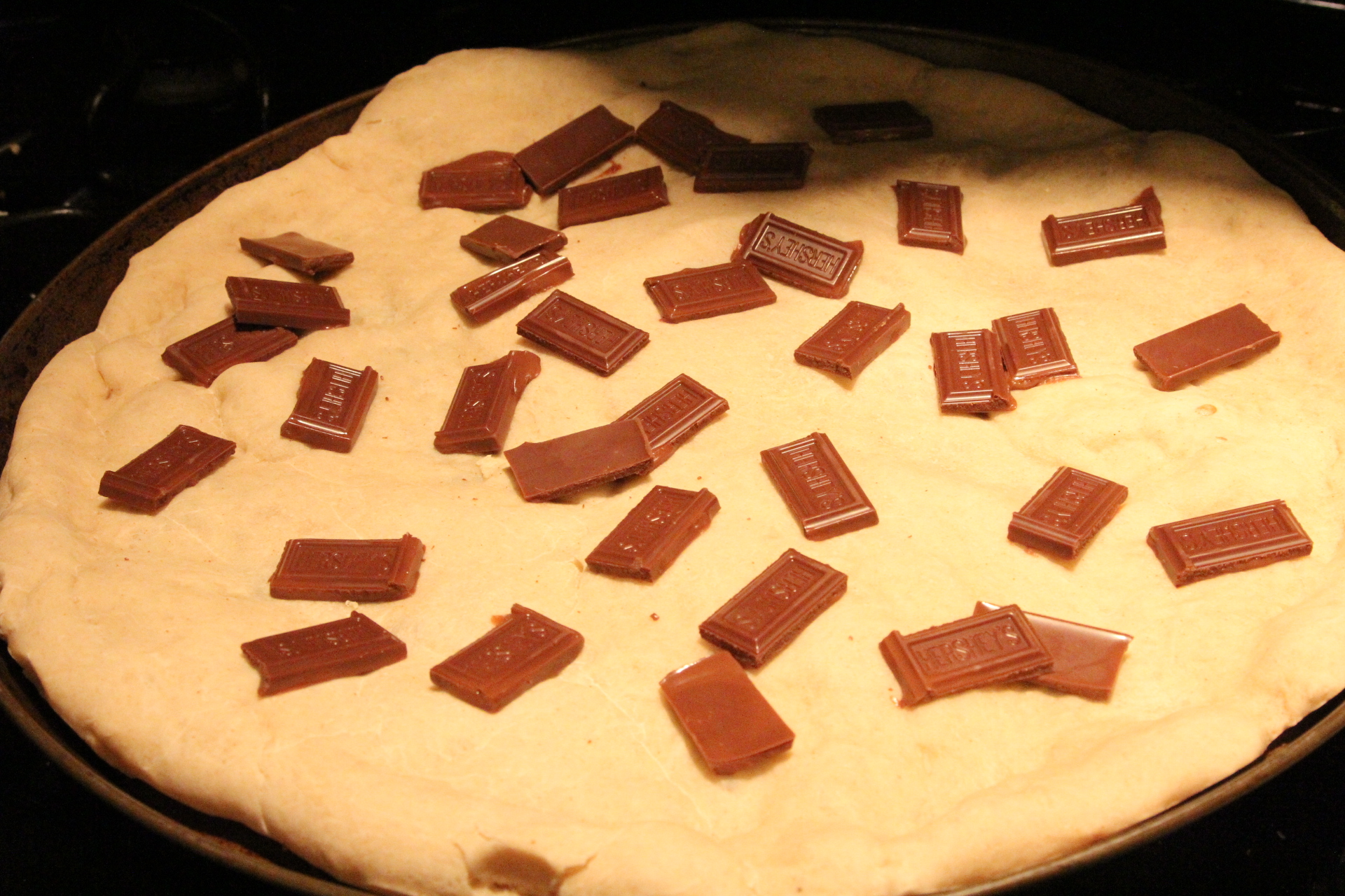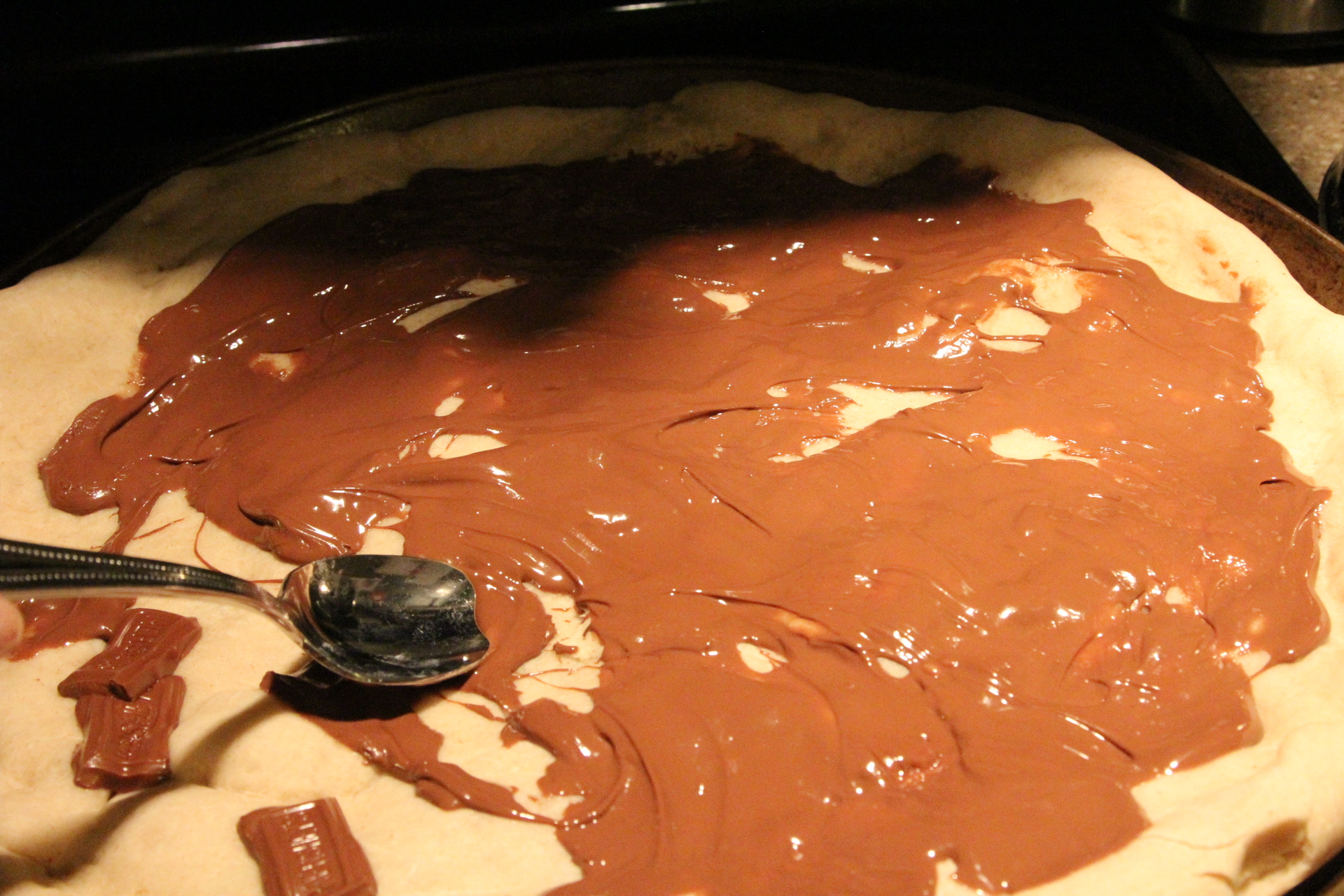 The chocolate will melt easily on the hot crust. Just spread it out with a spoon and then add on the rest of your toppings.