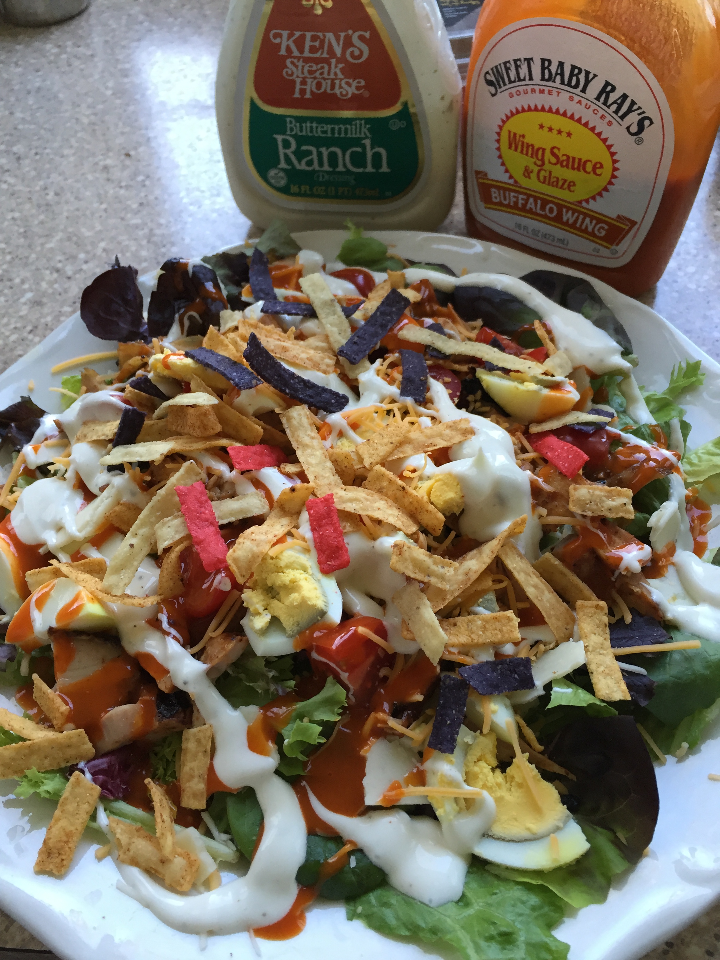 I used a combination of Romaine lettuce and spring greens, topped with the leftover buffalo chicken (cold), added in some hard-boiled egg, tomatoes, cheddar cheese, little tortilla salad topping thingys, some ranch dressing and a little bit more buffalo sauce. Oh my! That was one tasty salad.