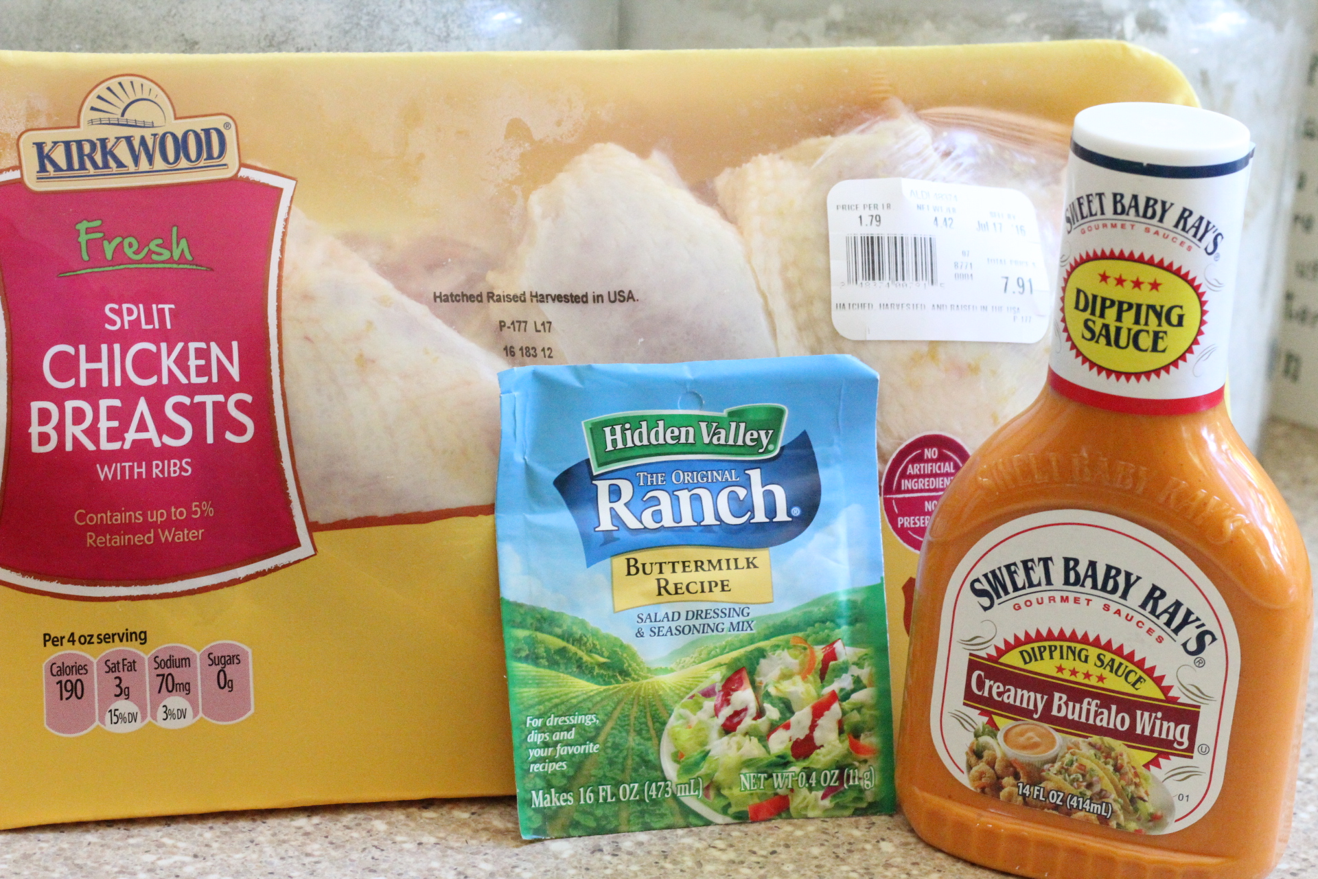 One packet of ranch dressing mix. This is optional. Actually, I forgot to add it in the first time I made my buffalo chicken and it still tasted great. If anything, I think the ranch cuts down on the little tiny baby buffalo kick that the sauce has.