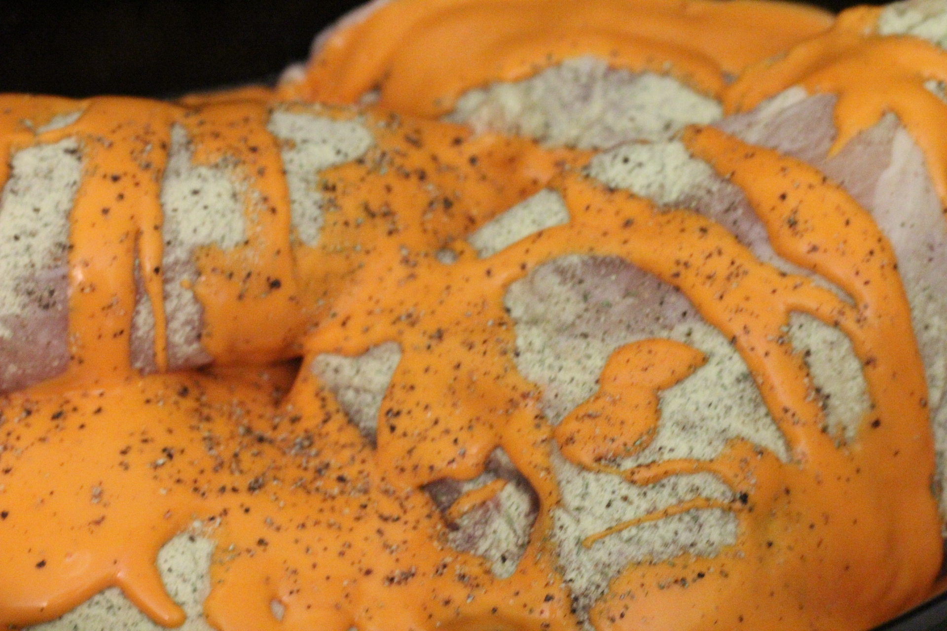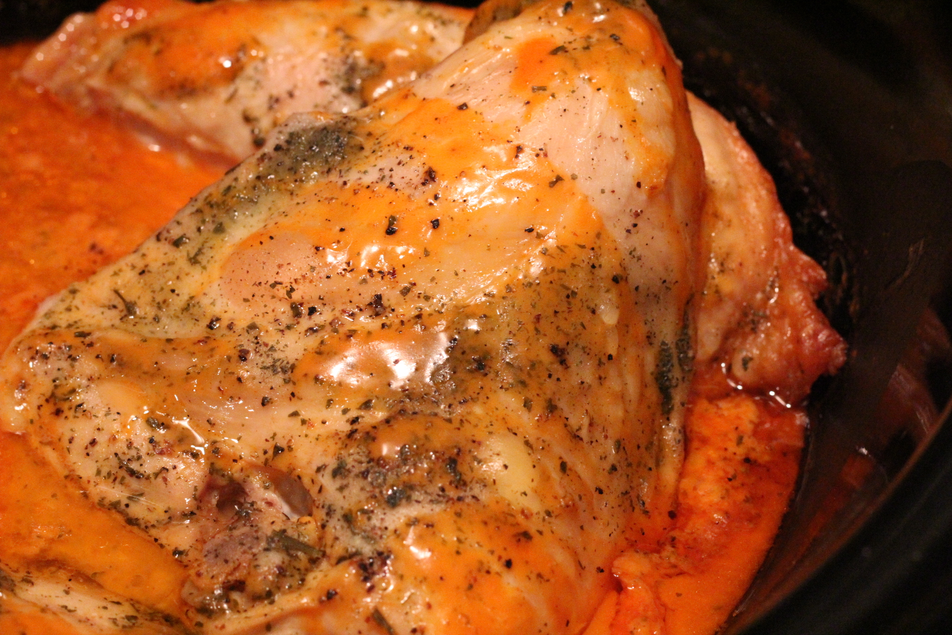Basically throw your chicken in the crockpot, sprinkle on the ranch packet and then add in about half the bottle of buffalo sauce on top of the chicken. I sprinkle on some pepper too.