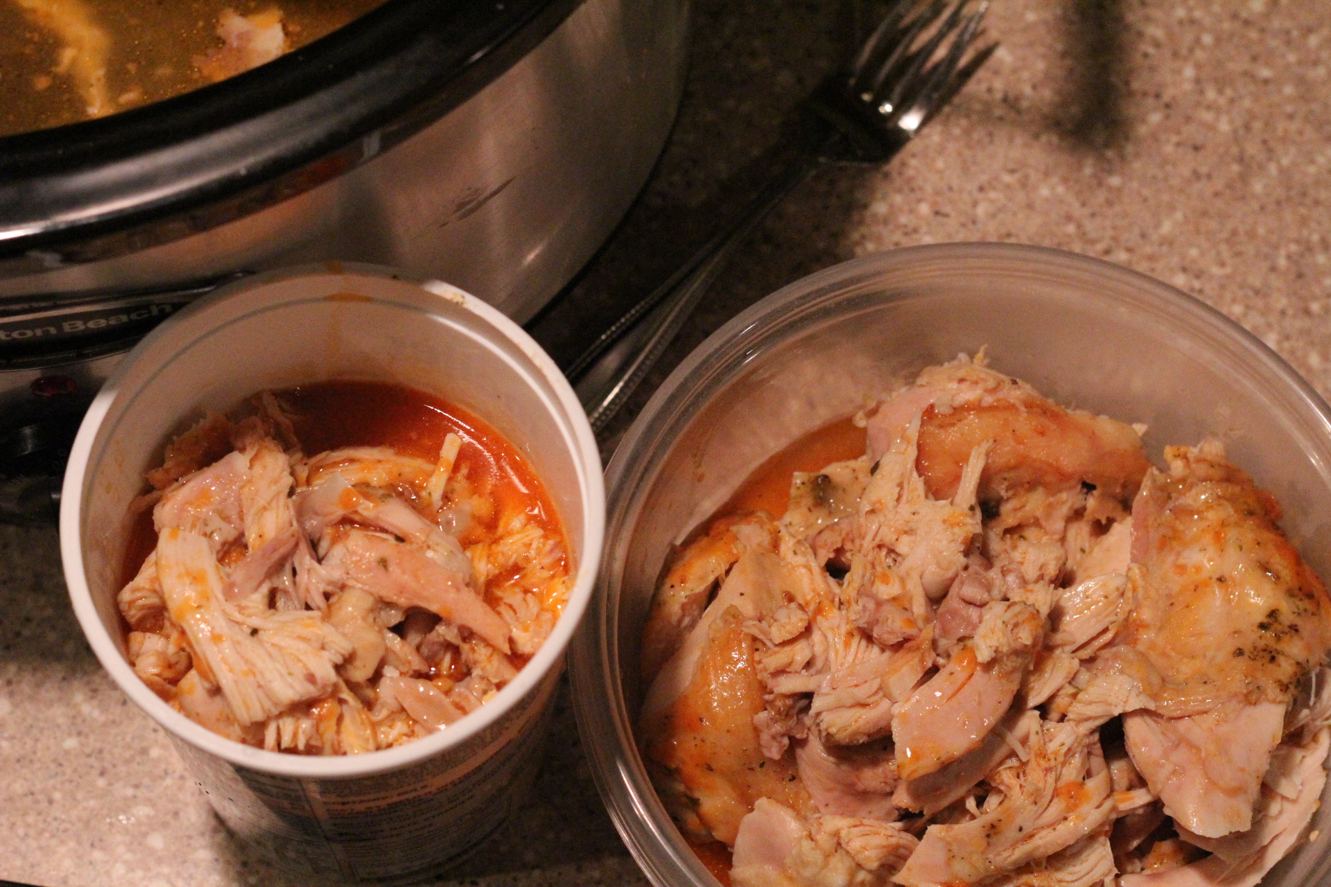 I have the container on the left more finely chopped. This will be used for my Buffalo Chicken Soup. The larger container on the right is bigger pieces of the buffalo chicken that I’ll use for other meals. Both go in the fridge. Go ahead and freeze if you won’t be using it within a few days or if you are a planner and making this in advance.