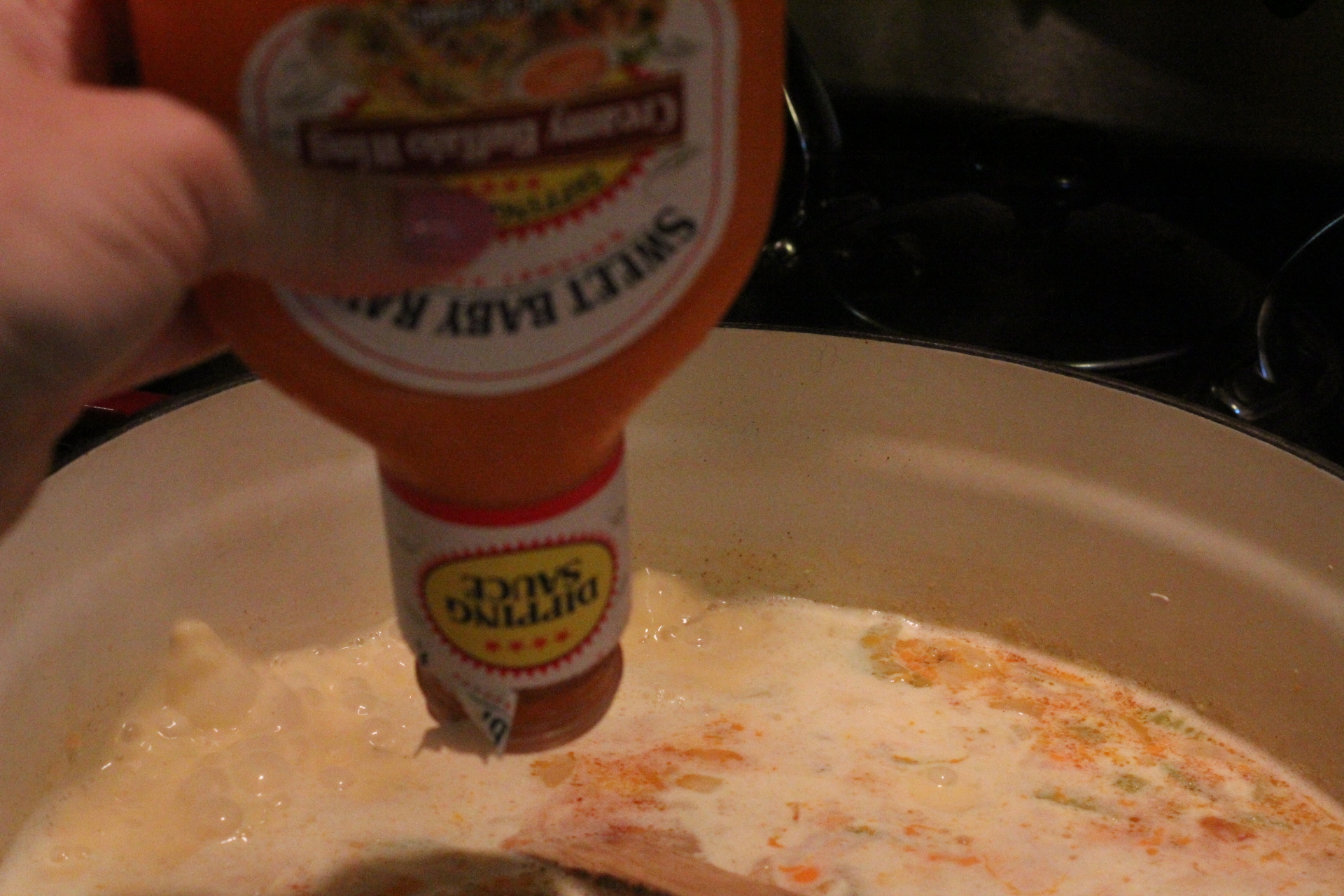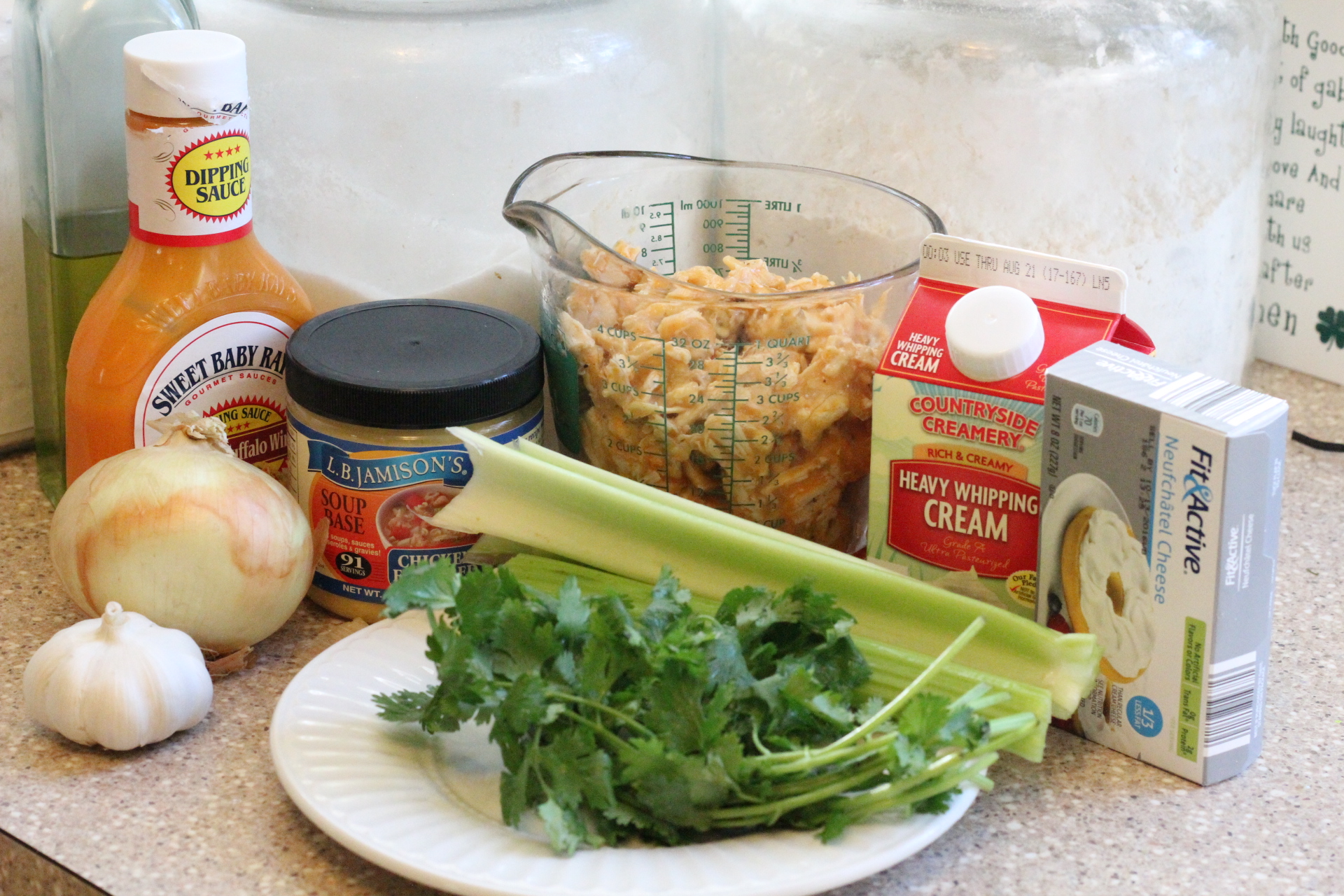 Add in the cooked shredded and de boned chicken and buffalo sauce that is with it.
