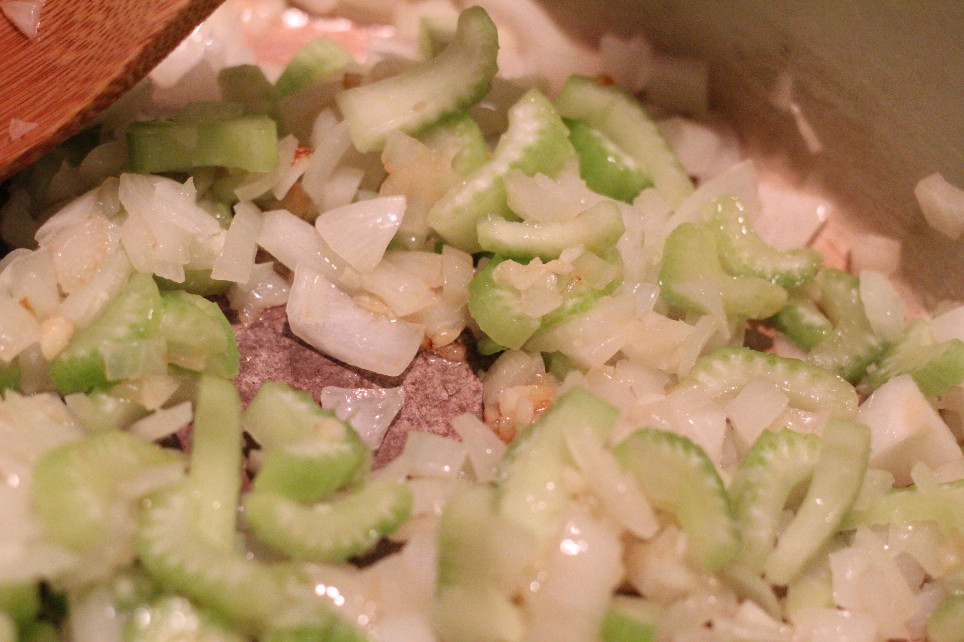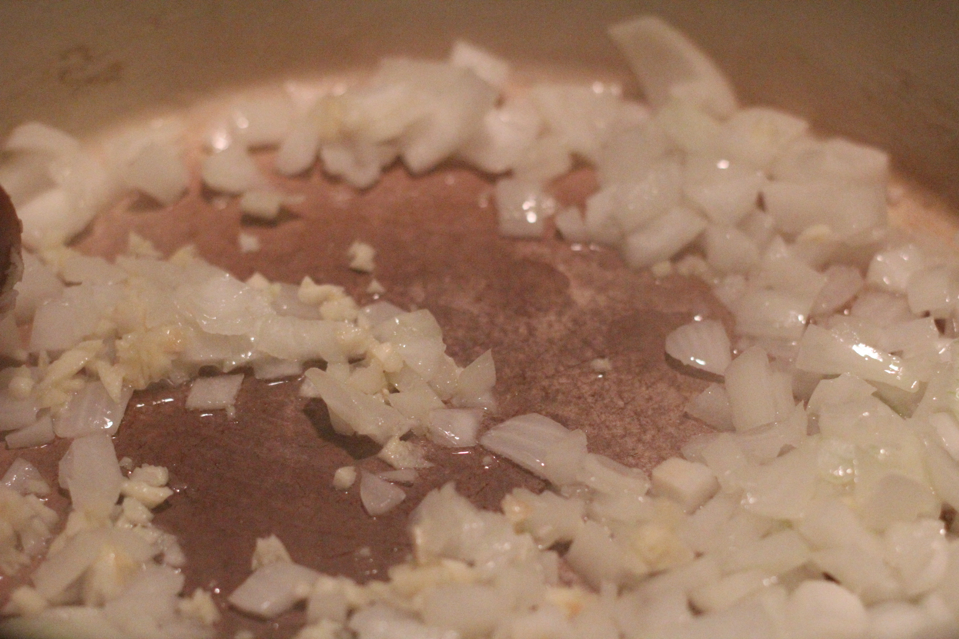 In a large pot (at least 6 quart), heat olive oil and sauté diced onion on medium heat.