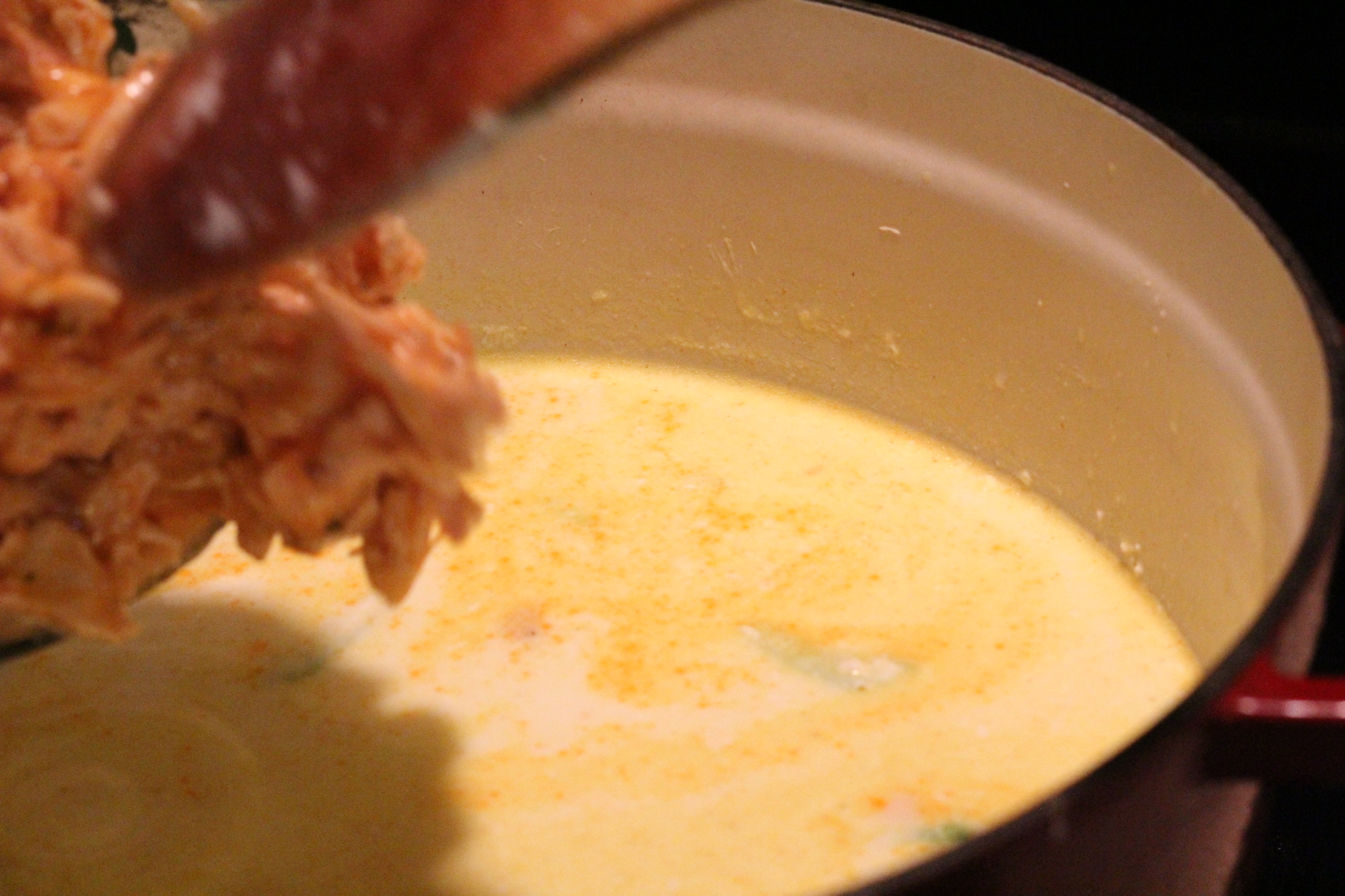 Now, it’s time to add in that buffalo chicken that you have made up.