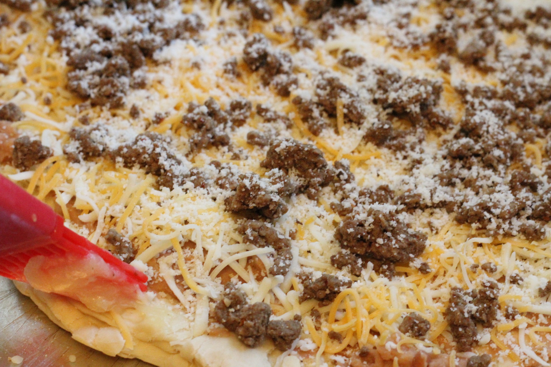 To finalize this Taco Pizza, I brush the crust with a little butter and then sprinkle a little salt.
