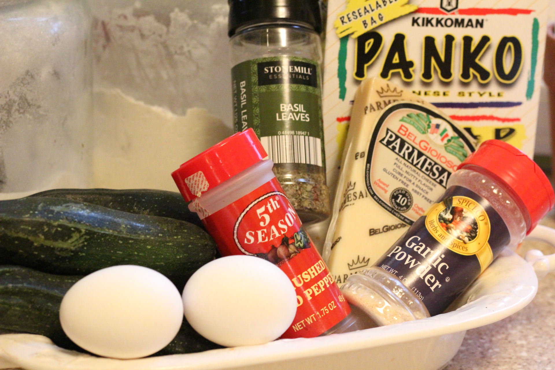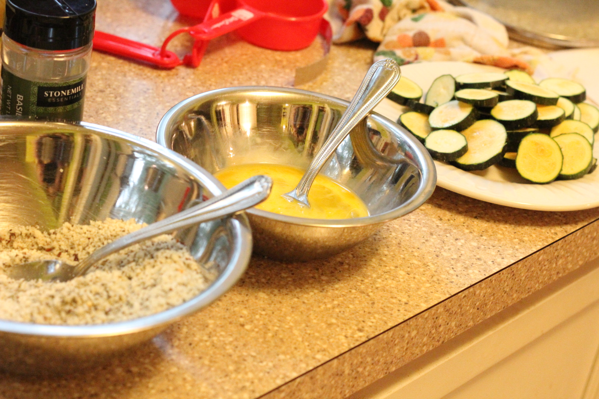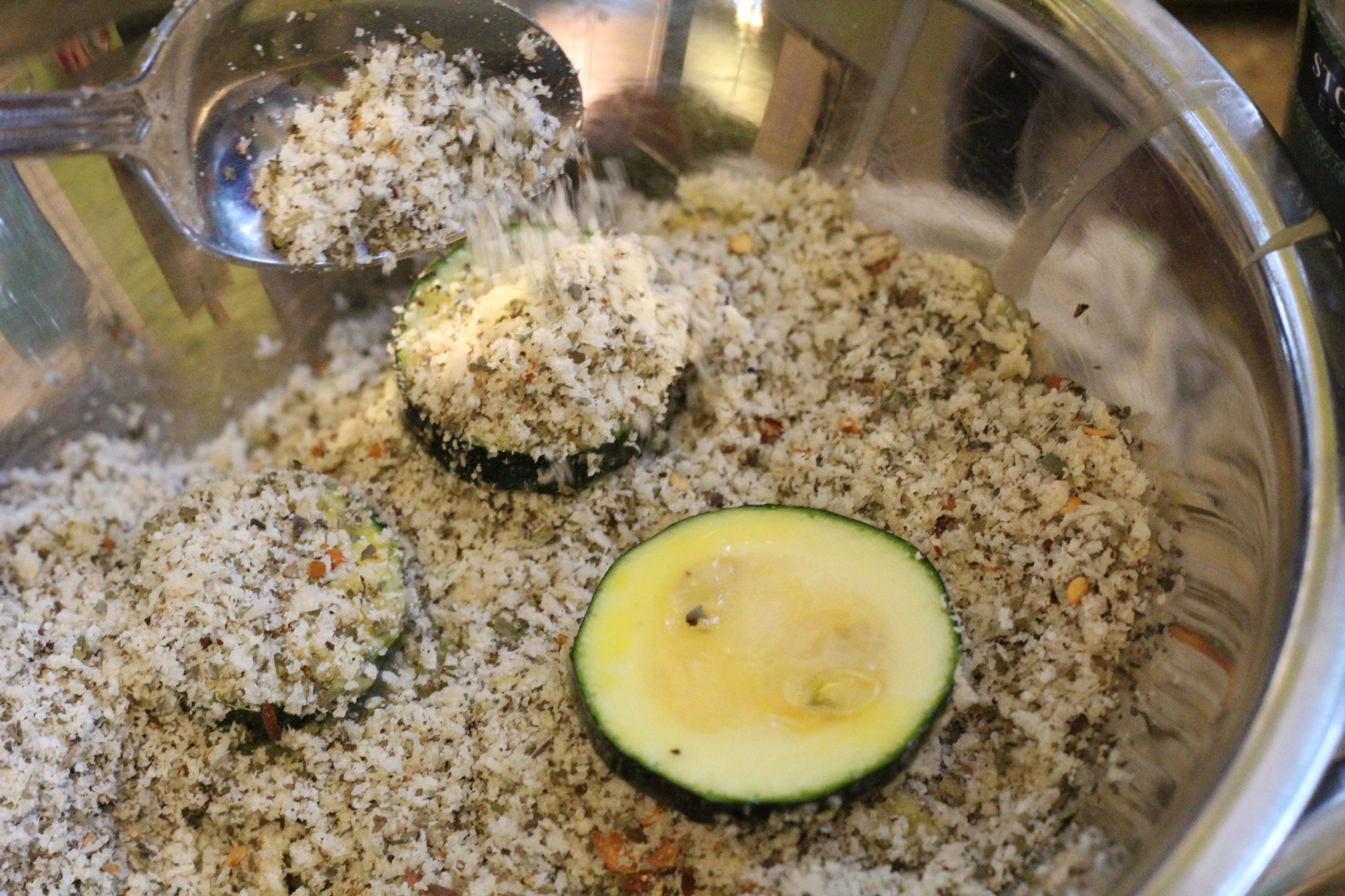 Start dredging the sliced zucchini in the eggs, and then into the breadcrumb mixture. Repeat if needed to make sure they are well coated.