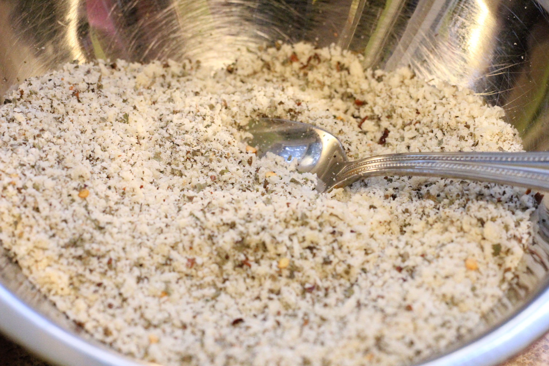 Combine the breadcrumbs, grated parmesan, and spices together in a bowl.
