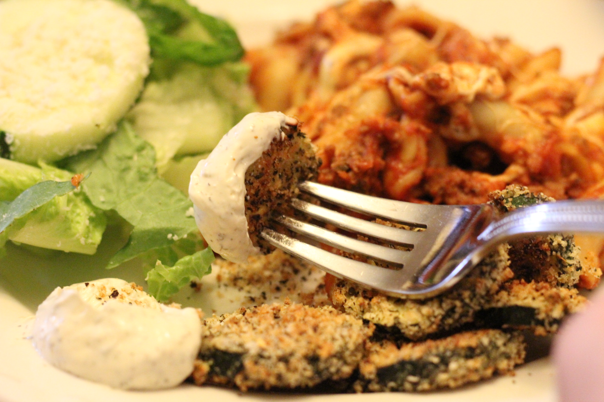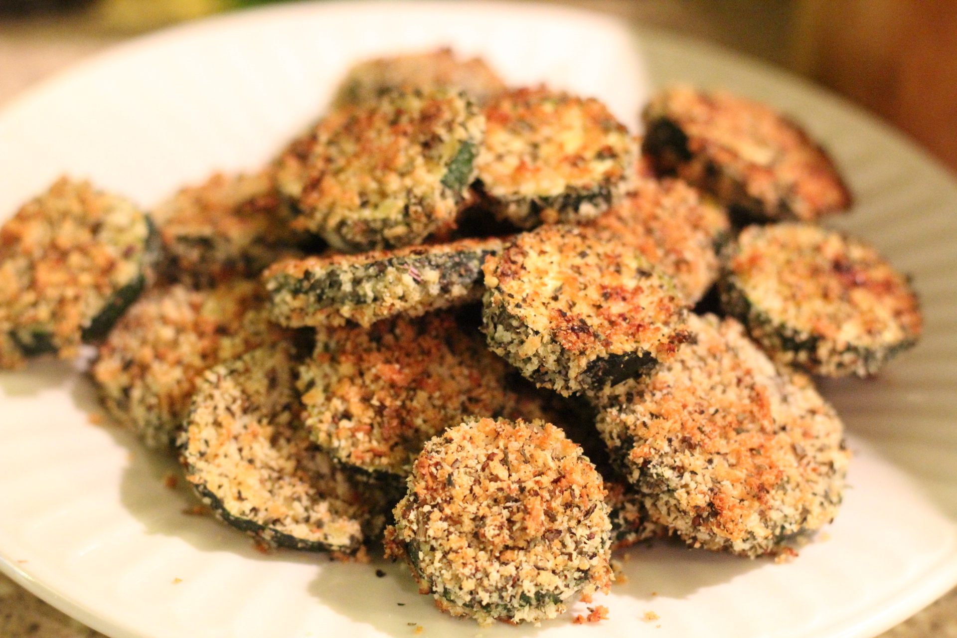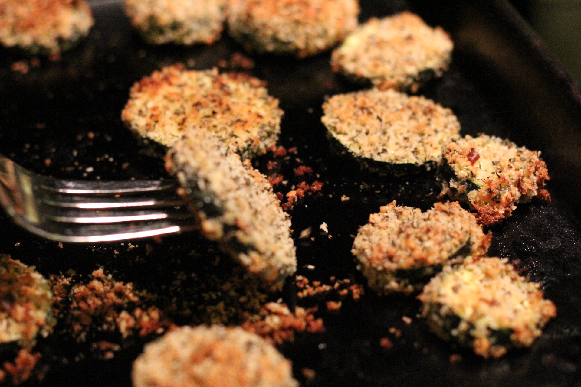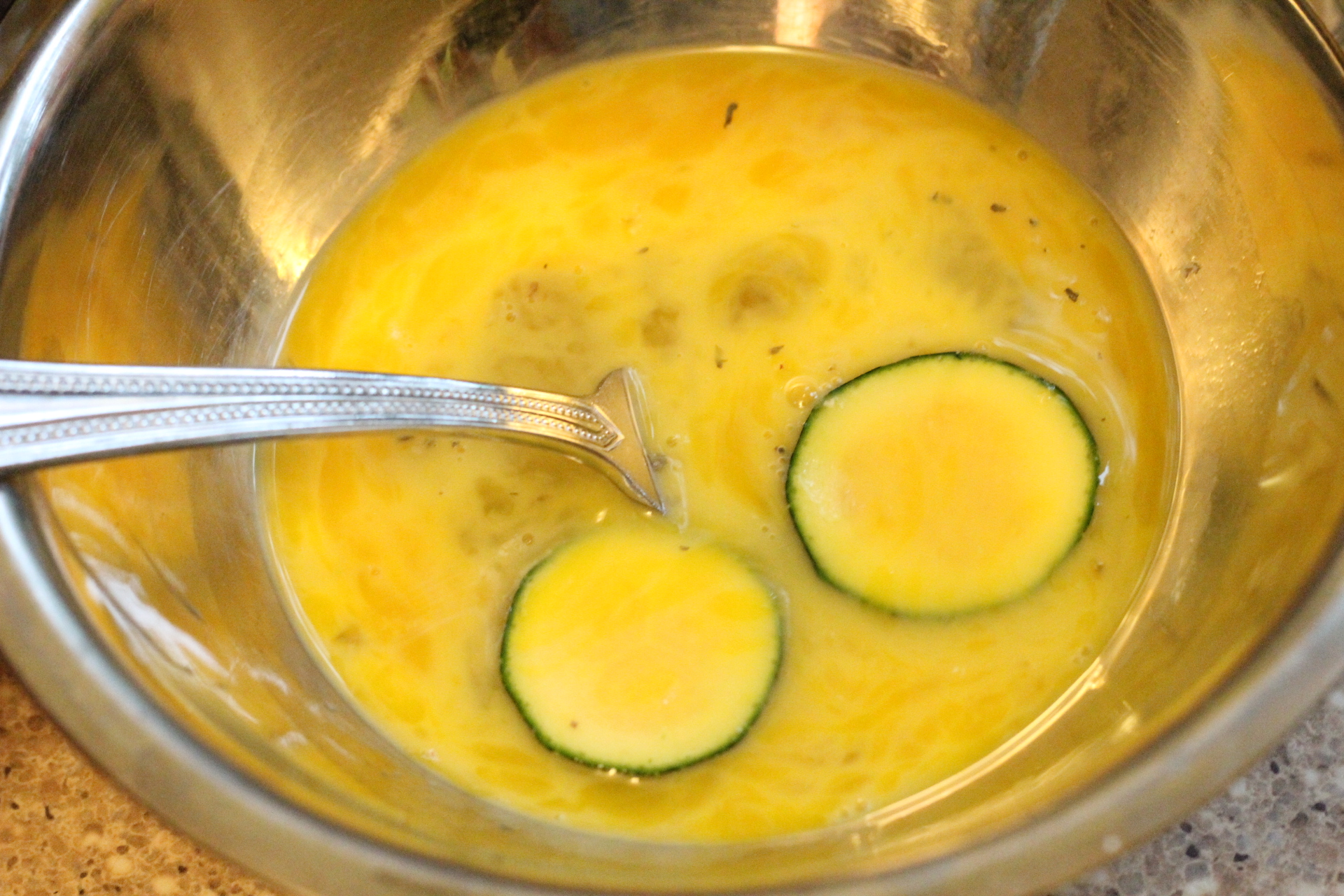 Dunk the zucchini slices into the eggs and then into the breadcrumb mixture. Dunk again in egg and breadcrumbs if needed to make sure the zucchini is well coated.