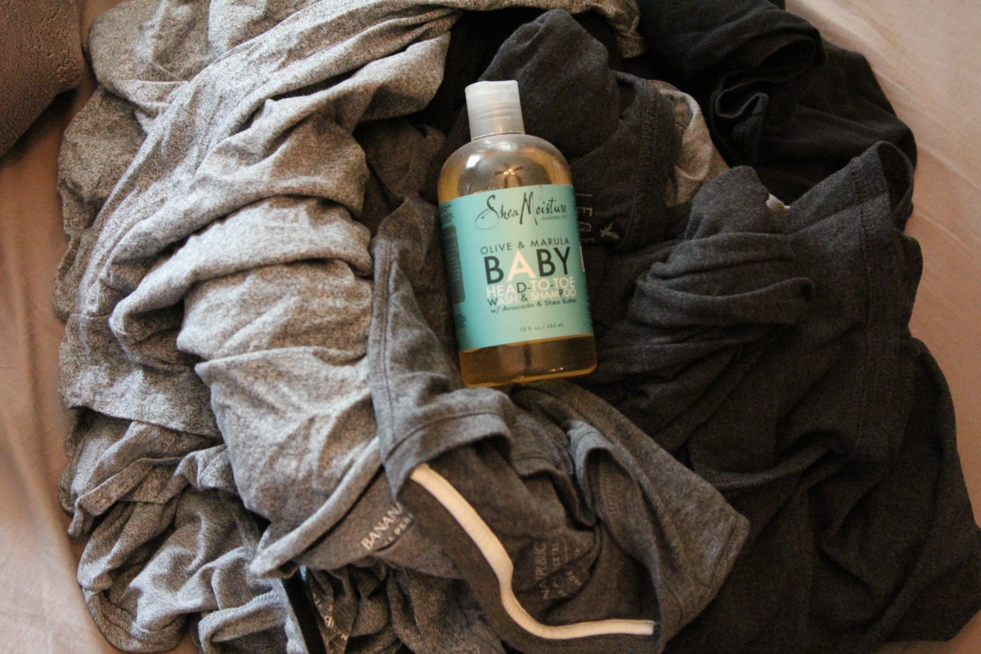 When I frantically searched how to stretch clothes after that dryer mishap, I found a few methods. Some use hair conditioner. Some use Lotion. I wanted to find a method that wouldn’t leave any type of residue on the clothes so I could avoid washing them all over again. For this method, you only need baby wash or an all in one baby wash/shampoo. It’s gentle and helps to loosen the cotton fibers. You also need warm water. I tend to wait until I have a few shirts to do so I just plop them all in the bathtub. You could use a sink for a smaller load. Also, you’ll want to keep similar colors together. All of our shrunken shirts were dark so I was able to do them all in one batch. You’ll need space for draping and hanging them to dry. Arms of a treadmill or elliptical, or really any dust collecting piece of exercise equipment works great for this. Dust it off, first though! You’ll also need a few towels.
