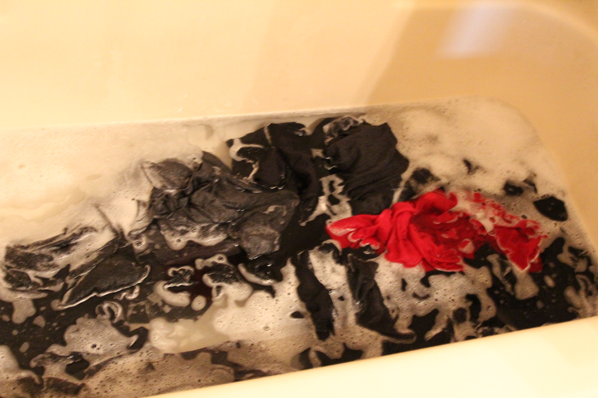 Step Seven – Hang the clothing up to dry, either over a bar or drying rack. Do not hang shirts up on hangers, or you’ll have little camel humps in the shoulders and that’s a whole other thing to try to fix.