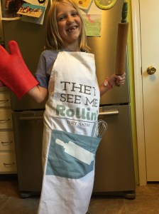 How fun is that apron! It was a TJ Maxx find.Lilly went to Chef camp for a week a few years ago at a local university. She has always loved cooking and it was a great opportunity for her to learn some real skills and recipes from professionals. She was able to have hands on experience following recipes, using the stove, flat top grill, and all kinds of professional cooking equipment. One of her favorite recipes she learned was chocolate chip cookies.
